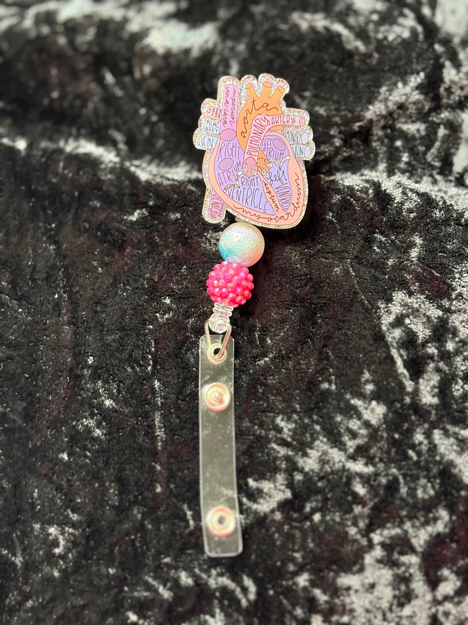 Thick acrylic badge reel with heart anatomy design with sparkly beads attached to the bottom. The badge reel has an alligator swivel clip with press and clip style clamp. Each badge reel comes individually wrapped.