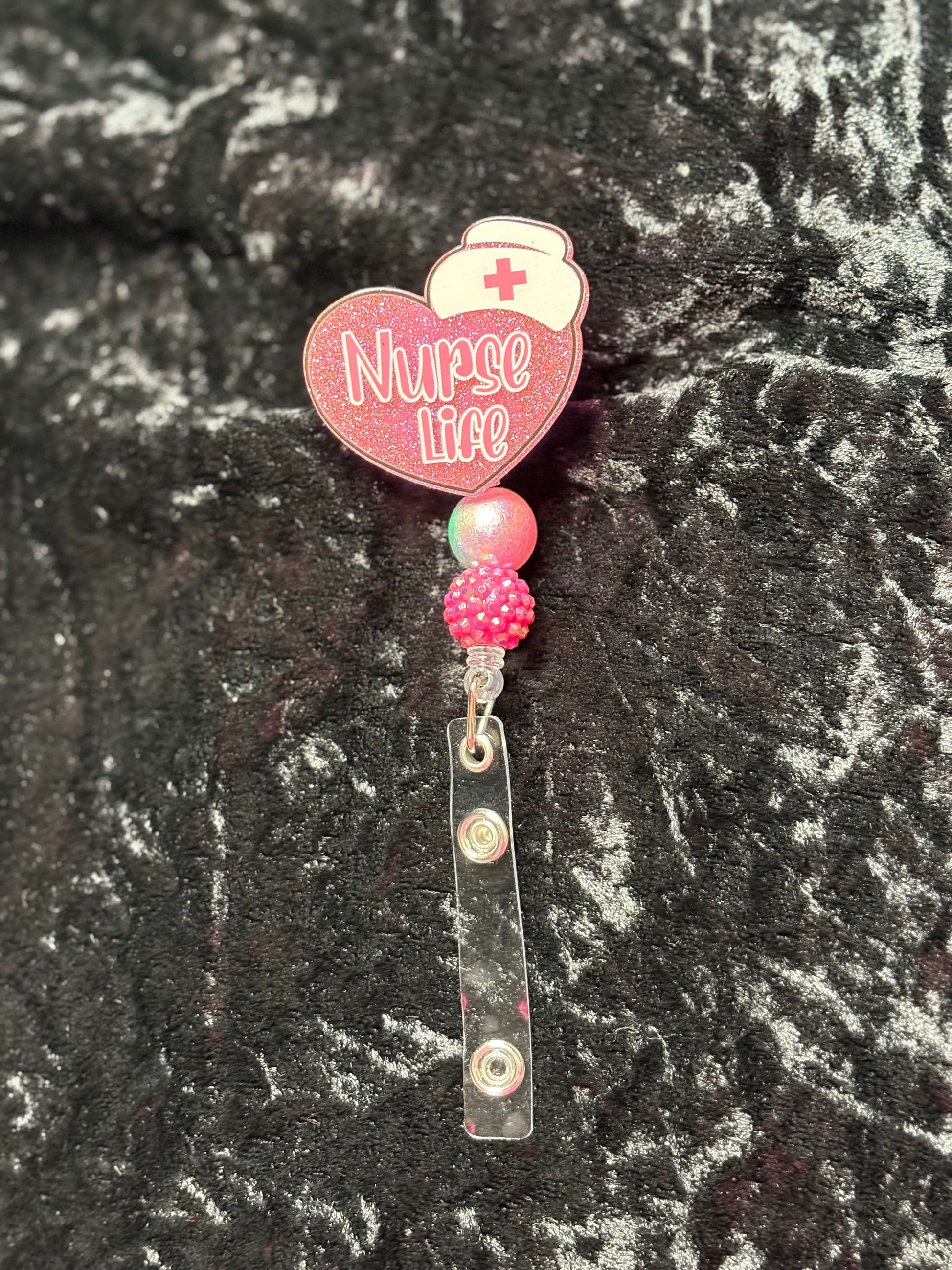 The reel has pink glitter, pink words outlined in white with sparkly beads attached to the bottom. The badge reel has an alligator swivel clip with press and clip style clamp. Each badge reel comes individually wrapped.