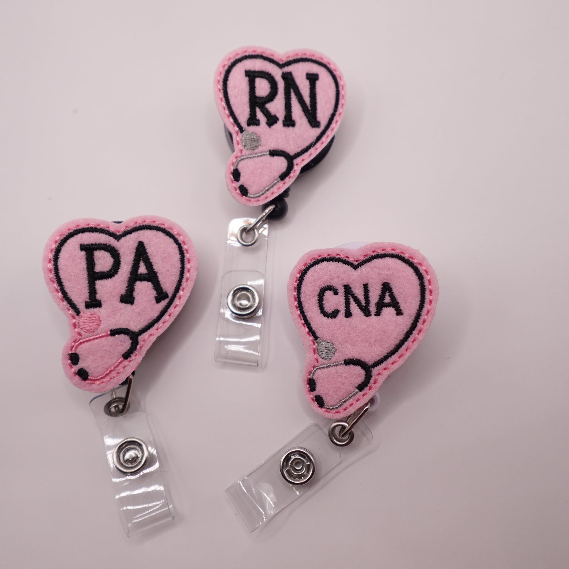 Cloth pink hearts with black writing and stethoscopes. The badge reel has an alligator swivel clip with press and clip style clamp. Each badge reel comes individually wrapped.