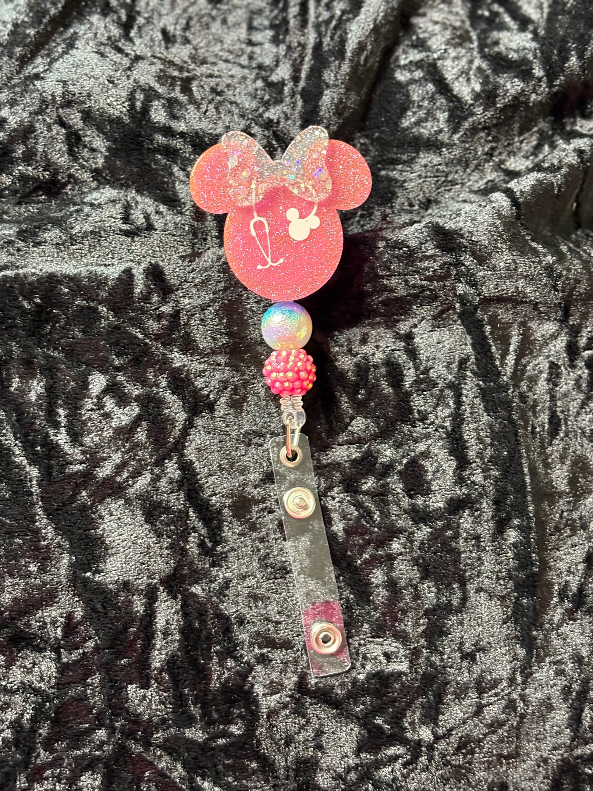 The reel has silver/pink glitter, a white mini stethoscope, with sparkly beads attached to the bottom. The badge reel has an alligator swivel clip with press and clip style clamp. Each badge reel comes individually wrapped.