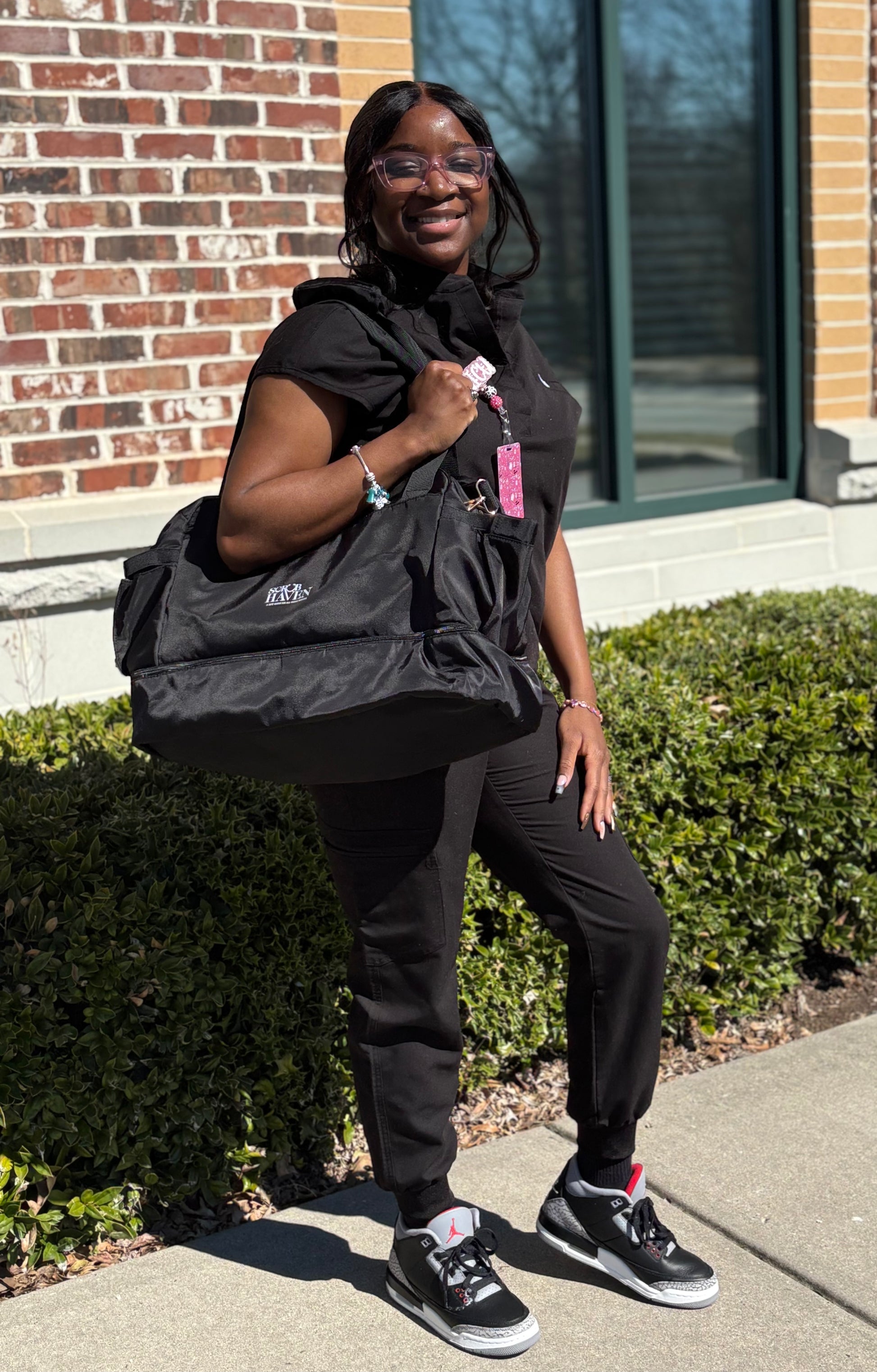 A work tote is essential for everyone. Available in Black, Pink, and Beige, each tote and pouch features the Scrub Haven logo embroidery. Designed with an adjustable strap and several storage compartments, these bags are versatile enough for any travel needs. For cleaning, use cold water or simply wipe with a damp cloth when needed.
